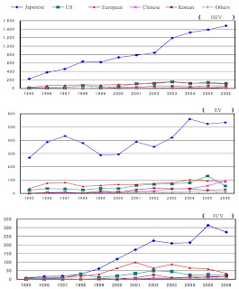 Delle domande presentate dai richiedenti giapponese nel 2006, - i 1.400 brevetti su HEV hanno superato di gran lunga i 530 brevetti legati agli EV ed i 270 brevetti sui FCV. Il numero di domande di brevetto è in costante aumento in tutti e tre i settori.