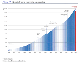 Secondo il Rapporto presentato dall’Agenzia Internazionale per l’Energia, la crisi economica ha provocato una forte riduzione della domanda di energia. Come si vede in questo grafico contenuto nel Rapporto consultabile tra gli allegati di questo articolo, i consumi di energia elettrica mondiale hanno subito per la prima volta dal dopoguerra un sensibile calo. Ma il calo della domanda ha determinato una forte riduzione dei prezzi del barile, la cui conseguenza è stata un crollo drammatico degli investimenti in tutti i settori: ricerca ed esplorazione, raffinazione, distribuzione di idrocarburi, ricerca e sviluppo delle tecnologie verdi e dell’energia nucleare. Una sintesi della situazione è contenuta in questo articolo di Federico Rendina sul sito del Sole 24 ore.